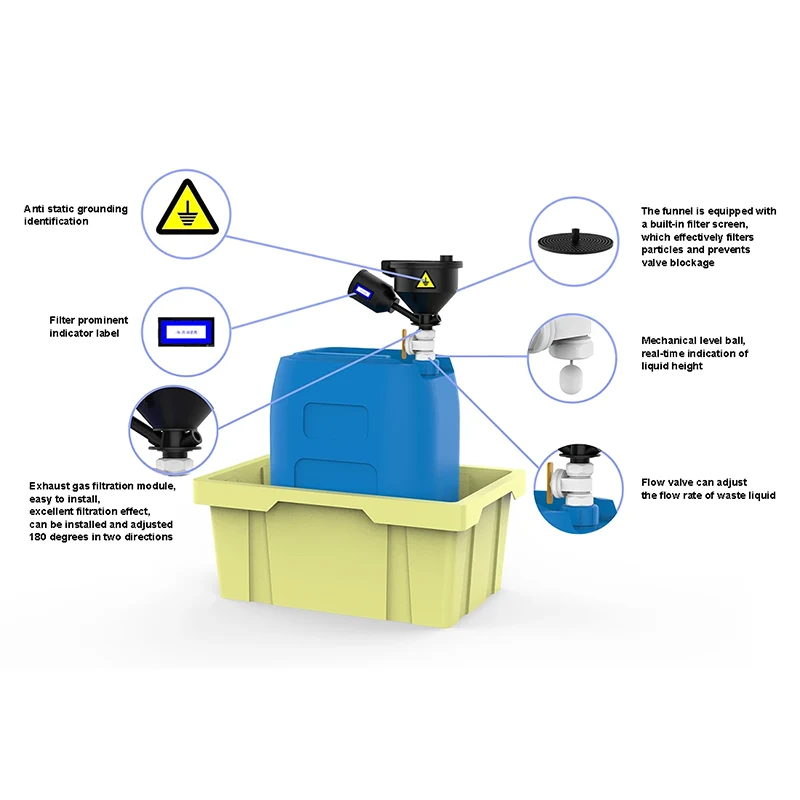 கழிவு திரவ சேகரிப்பு சாதனம் குறிப்பிடத்தக்க பண்புகளைக் கொண்டுள்ளது. அதன் சேகரிப்பு கொள்கலன் இறக்குமதி செய்யப்பட்ட ஆன்டி-ஸ்டேடிக் பிபி மூலப்பொருட்களால் ஆனது, இது பொருளின் நிலைத்தன்மையை உறுதி செய்வது மட்டுமல்லாமல், ஆண்டிஸ்டேடிக் ஏஜெண்டின் செயல்பாட்டையும் திறம்படச் செய்கிறது, கழிவு திரவ புனலின் நிலையான மின்சாரத்தை 10^5 முதல் 10^9 வரை கட்டுப்படுத்துகிறது, நிலையான மின்சாரத்தால் ஏற்படும் பேரழிவுகளின் அபாயத்தை வெகுவாகக் குறைக்கிறது. புனல் ஒரு அதிநவீன வடிவமைப்பைக் கொண்டுள்ளது. லீக்-ப்ரூஃப் டாப் கவர் ஒரு சீல் கவர் மற்றும் ஒரு ஸ்பிளாஸ்-ப்ரூஃப் ஃபில்டர் ஃபன்னலுடன் இணைக்கப்பட்டுள்ளது, மேலும் கழிவு திரவ சேமிப்பின் பாதுகாப்பை உறுதிப்படுத்த தேவையான வால்வை நிறுவலாம். எதிர் எடை வகை மேல் அட்டையானது 100Pa இல் திறந்து 50Pa இல் மூடும் உள் அழுத்த நிலைமைகளுக்கு ஏற்ப வெளியேற்ற வாயு வெளியேற்றத்தை தானாகவே சரிசெய்கிறது, வெடிப்பு மற்றும் தன்னிச்சையான எரிப்பு ஆகியவற்றைத் தவிர்க்கிறது. வெளியேற்ற வாயு வடிகட்டி ஒரு சுழல் முறையில் இணைக்கப்பட்டுள்ளது, இது மாற்றுவதற்கு வசதியானது மற்றும் இரசாயன கூறுகளின் ஆவியாகும் தன்மையைத் தடுக்கிறது. பல்வேறு வெளியேற்ற வாயு சிகிச்சைகளுக்கு துல்லியமான தழுவலுக்கு 5 வெவ்வேறு வகைகள் உள்ளன.